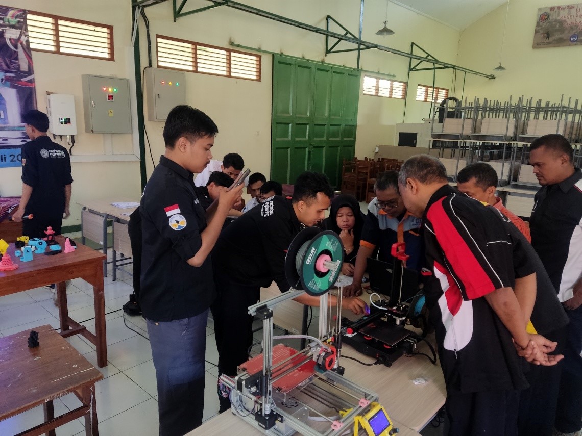 The Industrial Revolution 4.0 requires Vocational High Schools (SMK) to master key technologies such as 3D Printing. SMK Negeri 1 Windusari, the service partner, faces technology gaps, characterized by limited equipment and a lack of practical (hands-on) knowledge regarding FDM 3D Printing. The objective of this service is to enhance the knowledge and understanding of students, teachers, and lab assistants regarding 3D Printing (Additive Manufacturing) as a core pillar of Industry 4.0. The methodology involved integrating knowledge transfer and practical skills (learning by doing) using FDM machines. The service emphasized a participatory and community-driven relevance approach. Evaluation was conducted quantitatively using pre-test and post-test comparisons. Results showed a significant increase in competence, with the participants’ average score rising from 50.67 to 74. This strengthens the competence of the Machining Engineering Department, preparing adaptive graduates in the field of Additive Manufacturing.