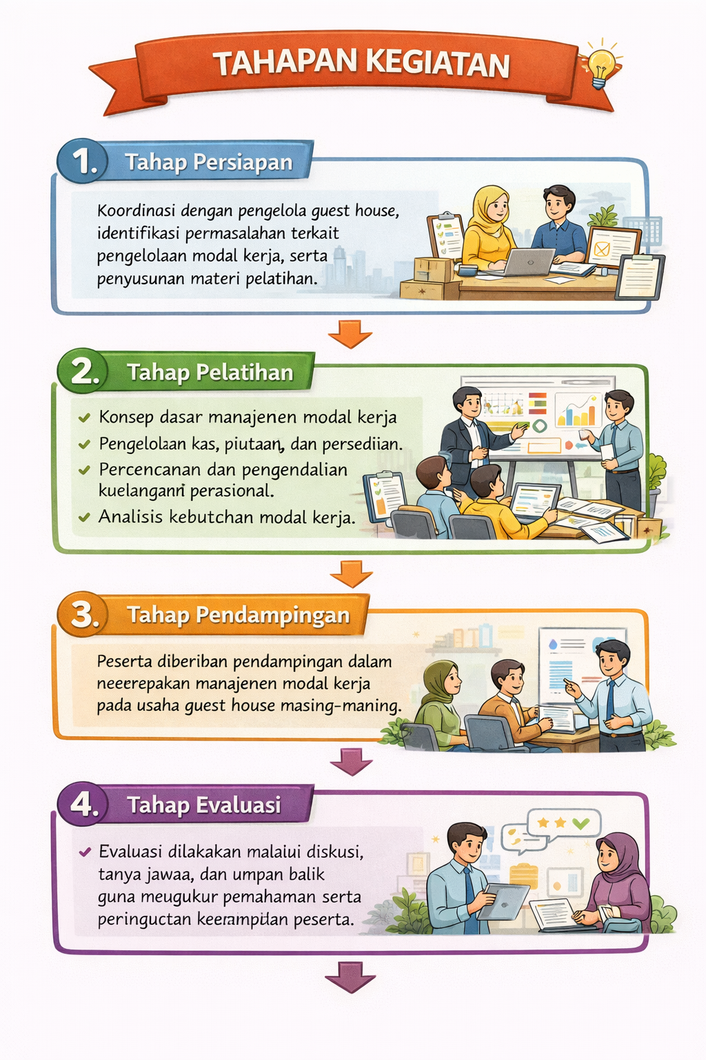 Program pengabdian ini bertujuan untuk meningkatkan kemampuan pengelola guest house dan hotel bintang tiga di Kota Semarang dalam mengelola modal kerja secara efektif agar operasional tetap lancar, likuiditas terjaga, dan profitabilitas meningkat. Melalui pelatihan dan pendampingan, para mitra diberikan wawasan tentang perencanaan kebutuhan modal kerja, pengelolaan aktiva lancar dan hutang lancar, serta analisis dan evaluasi laporan keuangan jangka pendek. Permasalahan utama yang dihadapi mitra adalah kesulitan dalam memproyeksikan kebutuhan modal kerja, translasi antara siklus kas operasional dan musim kunjungan wisata, serta keterbatasan kemampuan dalam memonitor pengeluaran dan piutang. Solusi yang diterapkan meliputi kegiatan pelatihan interaktif, pendampingan pembuatan workbook manajemen modal kerja, dan simulasi kasus nyata. Pelaksanaan menunjukkan peningkatan pemahaman dan penerapan alat pengelolaan modal kerja pada mitra, dan luaran yang dihasilkan baik berupa modul pelatihan, checklist manajemen modal kerja, maupun komitmen internal mitra untuk menerapkan praktik baru. Kesimpulan menyatakan bahwa pelatihan tersebut berhasil meningkatkan kapasitas mitra dalam manajemen modal kerja, dan direkomendasikan agar kegiatan dilanjutkan dengan monitoring berkala, serta perluasan ke lokasi-lain dan pelibatan pihak keuangan mikro lokal sebagai pendukung.