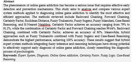 The phenomenon of online game addiction has become a serious problem that requires early detection and prevention. This study aims to analyze and compare several expert system methods that have been applied to diagnose online game addiction, to provide an overview of the most effective and efficient methods. The methods analyzed include Backward Chaining, Forward Chaining, Certainty Factor, Euclidean Distance, Fuzzy Tsukamoto, Fuzzy Sugeno, Fuzzy Mamdani, Case-Based Reasoning, and K-Nearest Neighbor. Based on a review of 15 literature sources, the results of the analysis show that the diagnostic accuracy of each method varies. Certainty Factor achieves an accuracy of 79-81.2%, the combination of Certainty Factor and Forward Chaining reaches 99.64%, Backward Chaining and Certainty Factor at 80%, while Fuzzy Tsukamoto with Fuzzy Sugeno and Case-Based Reasoning is able to achieve perfect accuracy of 100%. The conclusion of this study shows that hybrid methods that combine fuzzy inference and reasoning techniques, such as Fuzzy Tsukamoto-Fuzzy Sugeno and Case-Based Reasoning, show a very high level of accuracy and have the potential to be the most effective approach for an expert system for diagnosing online game addiction, mimicking the diagnostic capabilities of a psychologist.