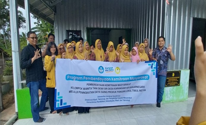Salah satu kelompok wanita tani produktif yang memproduksi pangan lokal tiwul intan adalah kelompok wanita tani Dewi Sri yang berlokasi di Desa Karanganyar Kabupaten Banjarnegara. Kelompok wanita tani Dewi Sri sama sekali belum memikirkan bagaimana upaya meningkatkan daya saing produk. Tujuan kegiatan adalah pemberdayaan kemitraan masyarakat kelompok wanita tani dalam rangka pengembangan daya saing dan pengembangan home industry berbasis pangan lokal untuk mendukung peningkatan pendapatan, kesejahteraan, dan keberlanjutan usaha. Metode pelaksanaan kegiatan adalah metode Participatory Rural Appraissal (PRA).Implementasi kegiatan meliputi kegiatan pendidikan masyarakat, difusi ipteks, mediasi, dan advokasi. Hasil kegiatan menunjukkan bahwa pengabdian kepada masyarakat pada kelompok wanita tani dikatakan berhasil dan membawa manfaat meningkatkan pengetahuan dan keterampilan terkait teknologi produksi, desain dan label kemasan, dan strategi pemasaran secara digital. Kegiatan pemberdayaan kemitraan masyarakat pada kelompok wanita tani dalam proses produksi, pengemasan, dan pemasaran produk tiwul instan terbukti efektif dalam meningkatkan daya saing produk.